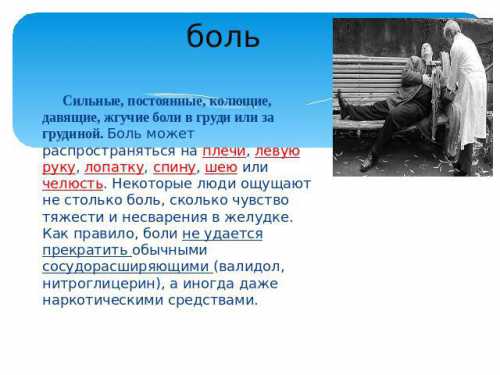 Нередко констатируется самостоятельное купирование стенокардии, благодаря чему больной может пойти на поправку. Предынфарктное состояние, которое прогрессирует, можно заподозрить при участившихся болях за грудиной. Еще одним намеком служит повышение давления. Присутствует яркий болевой синдром в зоне за грудиной, похожий на стенокардию напряжения. Однако, в отличие от нее, проявление боли можно устранить при помощи нитро глицерина. При состоянии, предшествующем инфаркту, нитроглицерин болей не убавляет, и в течение дня увеличивается количество приступов, иногда до за сутки. Все эти приступы постепенно приводят к омертвению определенного участка сердца. Боли отдают в ключицы, в руки, под язык и в правую сторону грудины. Данные проявления встречаются как у мужчин, так и у женщин. Больного бросает в холодный пот, охватывает беспокойство и возбуждение, сердце бешено колотится, появляется страх смерти, особенно, если появился дополнительный симптом удушье. Возможен также атипичный масштаб предынфарктного состояния, при котором пациента беспокоит головокружение, слабость, тревожный сон или вовсе его отсутствие. Болей, однако, не наблюдается. Если патология протекает в данной форме, обычно возникает одышка и цианоз, которые проявляются без какихлибо очевидных предпосылок и во время покоя. Диагностика в этом случае возможна только с помощью электрокардиограммы. Симптомы такого течения обычно просматриваются у пожилых лиц в возрасте от лет. В некоторых отдельных случаях появляется абдоминальный синдром, который характеризуется локализацией боли в левой подреберной части и верхней половины брюшного отдела. Больной жалуется на изжогу, считая, что причиной боли является желудок. Однако боль может быть колющей, режущей, ноющей. Усиливается при волнении и после физических нагрузок, в том числе и при ходьбе. Устранить патологические проявления поможет состояние покоя, а также прием нитратов. Боль в области живота, тошнота и рвота также могут быть симптомами предынфарктного состояния у пожилых людей. Спутниками этого состояния может служить рвота и тошнота, боль в области живота, икота, повышенное газообразование. В ряде случаев появляются боли в горле, шее и нижней челюсти. Однако сигналы о близком инфаркте могут ограничиться только одышкой или нарушением в ритме работы сердца. Цереброваскулярная форма предынфарктного состояния может сопровождаться обмороками, тошнотой и головокружением. Симптомы тревожного состояния свидетельствуют о том, что угроза получения инфаркта очень близко и требуется немедленное лечение. В данном случае оно ориентировано на то, чтобы предотвратить возможный инфаркт миокарда. Иными словами, лечение предназначено для устранения тяжкой формы стенокардии. Больному в этом случае предписан постельный режим, помогающий уменьшить нагрузки на сердце. Благодаря этому, снижаются его энергетические потребности. Острое состояние, предшествующее инфаркту, как у мужчин, так и у женщин требует неотложной помощи медиков. До приезда скорой больной должен получить под язык одну таблетку. Если раньше данного рода симптоматику пациент устранял при помощи. Валидола, то в этот раз он также может быть применен. Возможно лечение другими препаратами, такими как. Купировать приступ можно с помощью внутри мышечно