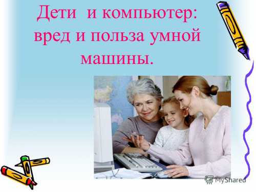 Отрицательное влияние компьютера на ребёнка. Самый большой вред компьютера в том же, в чём и его достоинство в его бесконечной увлекатель ности. Вред компьютер приносит в том случае, когда дети не соблюдают простые правила, предназначенные для того, чтобы свести к минимуму дурное влияние компьютера на своё здоровье не испортить зрение, не искривить позвоночник, не впасть в психологическую зависимость от электронной игрушки. Дети, увлеченные компьютером, не замечают утомления и усталости глаз, они могут очень сильно их перегрузить. Тем более, если ребенок играет в компьютер, а не занимается какойто обучающей программой. Поэтому, чтобы сохранить своему ребенку хорошее зрение, всегда контролируйте, сколько времени он проводит перед экраном. Растущий организм, нуждается в движении. Изза длительного неподвижного состояния ухудшается самочувствие ребенка, происходят сбои в организме, это чревато развитием гиподинамии. Когда ребенок много играет в компьютерные игры, это сопровождается эмоциональным напряжением, что так же не проходит бесследно. В результате, просидев весь день перед компьютером, ребенок к вечеру приходит в возбужденное и раздраженное состояние, становится агрессивен и не управляем, а ночью плохо спит. С компьютером дети, как правило, общаются один на один, что не способствует развитию навыков общения и игре в коллективе. Происходит падение умственных способностей. Ученые обнаружили, что компьютерные игры стимулируют лишь те участки головного мозга, которые отвечают за зрение и движение, но не способствуют развитию других важных его участков.